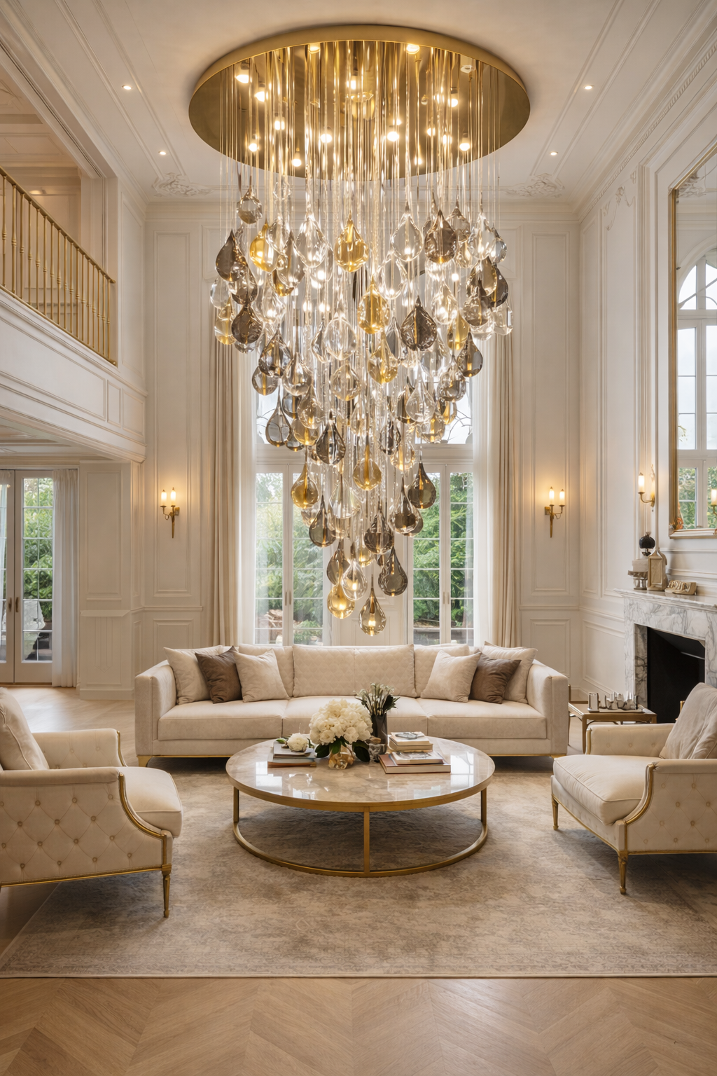 Elevate your entryway with this commanding double-height stair chandelier, engineered for dramatic vertical spaces. Spanning 4 feet in diameter and extending 10 feet in height, this architectural fixture commands attention across double-story foyers and grand staircases. The 70-pendant composition—20 clear, 25 amber, and 25 smoke glass—creates a sophisticated interplay of light and shadow, allowing you to customize ambiance through selective illumination. Each pendant is meticulously arranged to ensure balanced light distribution across expansive areas. Ideal for luxury residences, high-end hospitality venues, and contemporary estates seeking a statement piece that combines scale with refined elegance.