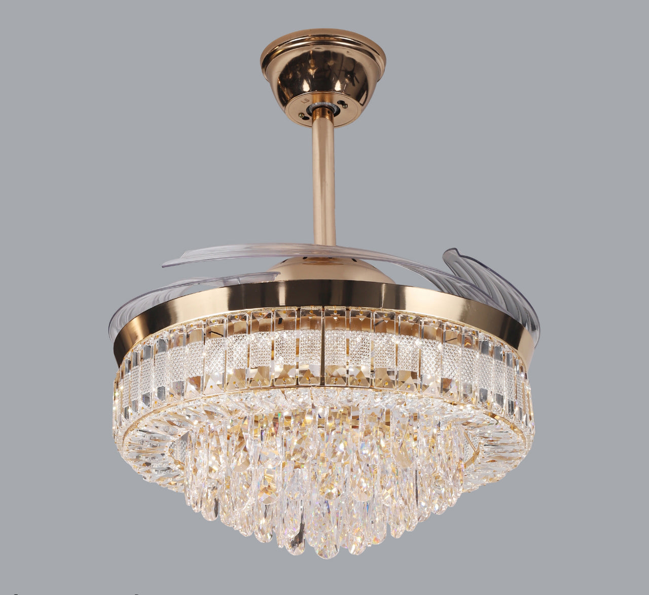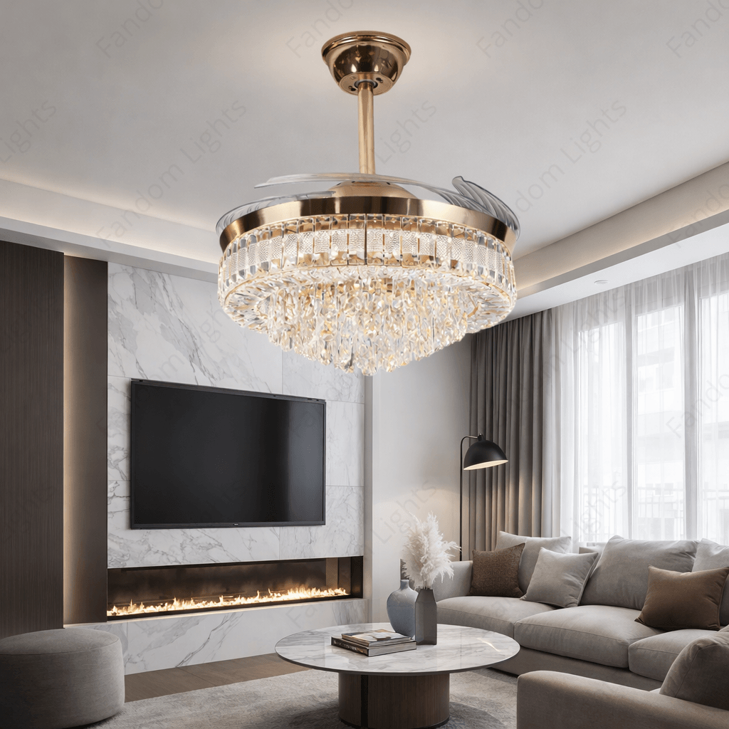 Invisible Gold Ceiling Fan Chandelier with K9 Crystal and Remote Control Retractable ABS Blades - Warm White