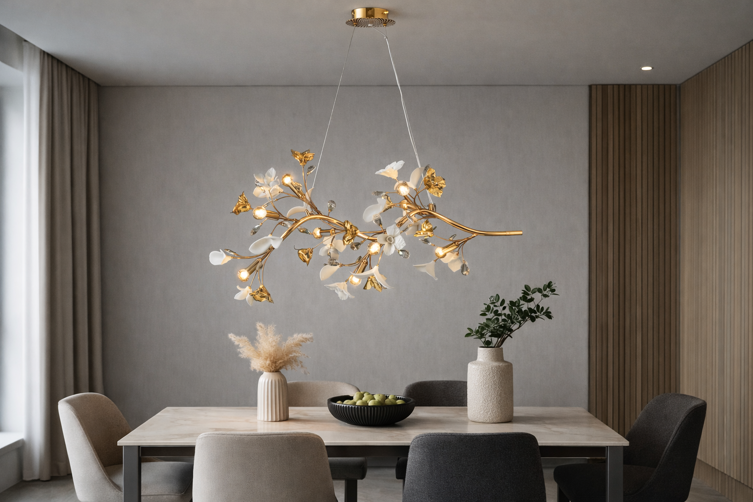 1000MM LONG GOLDEN CRYSTAL CERAMIC FLOWER CHANDELIER CEILING LIGHTS HANGING